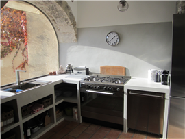 The kitchen looks out over the terrace and the Luberon Mountains. Now you can see the oven you’ll know why we wanted to find free-range chickens and farm fresh carrots, aubergines and beans.