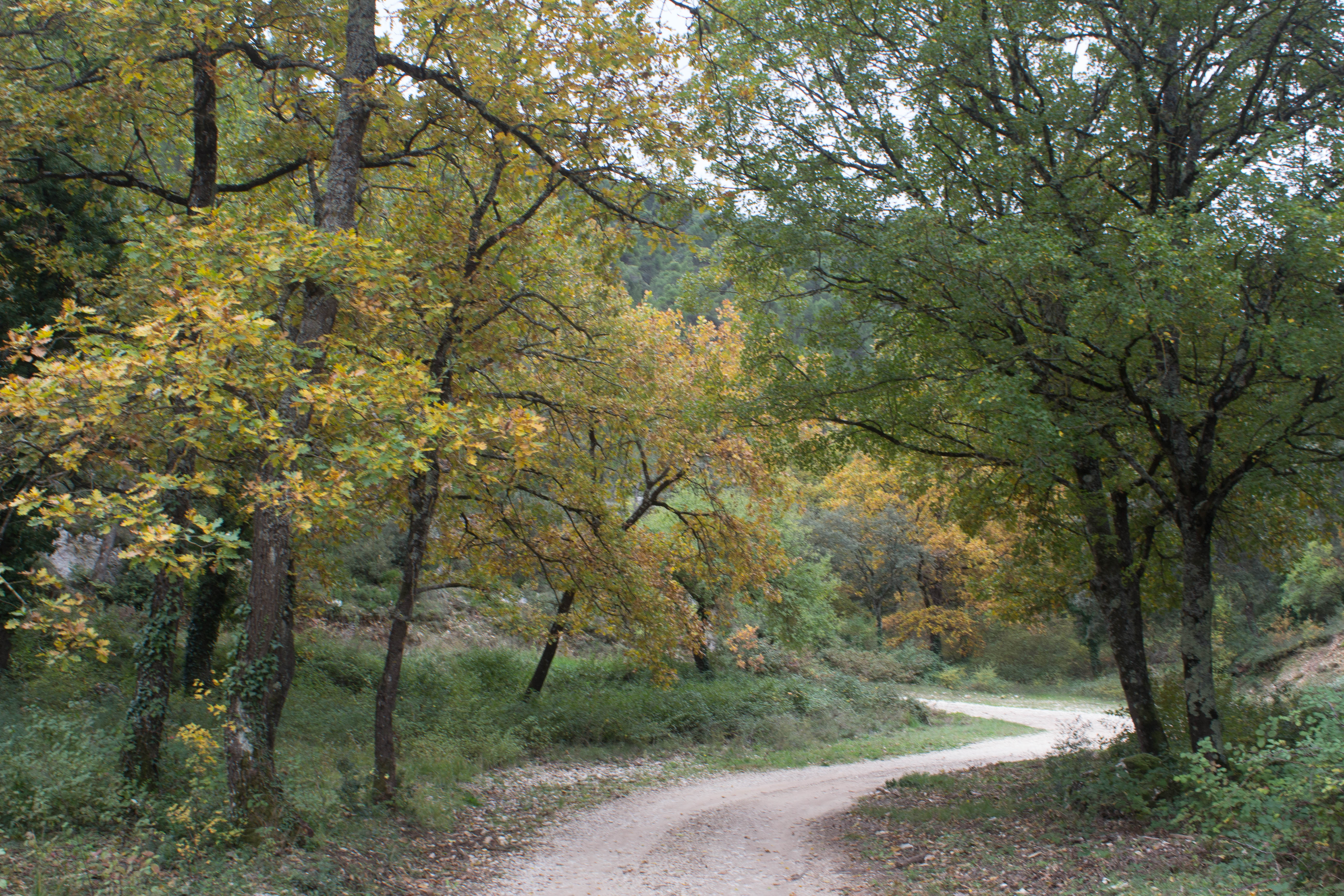 The road wound through narrow passageways between high banks of dry stone walls keeping back the hills, and the trees covered in vines made arches over our heads. Most leaves had turned russet, coral and yellow in the two and a half weeks since we arrived. Today the wind gusts sent the trees on the ridges into a frenzy. It sounded like the rush of a waterfall. Leaves rained on us.