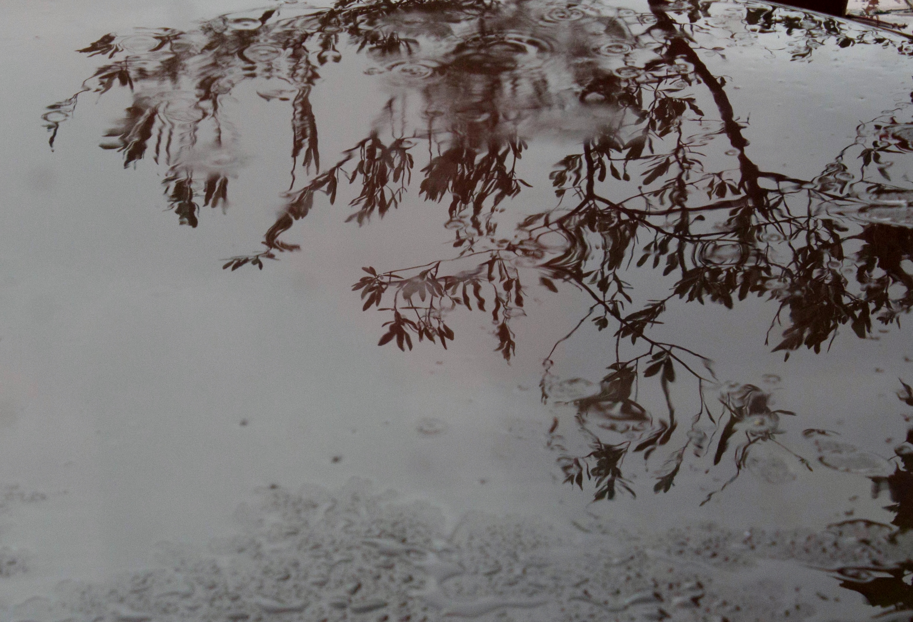 Nothing can be done but to stay home and write. It’s raining on my desk on the terrace and the shadow of the olive tree is taking up all the space.