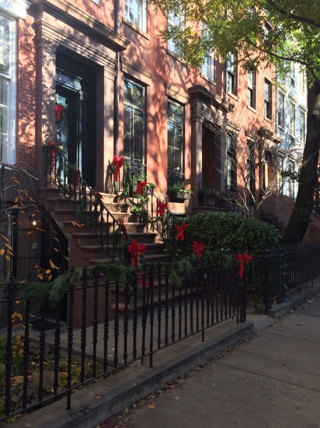 The city is wearing its Christmas dress. Christmas fairy lights, wreaths, pine branch runners, and rows of Christmas trees for sale along the streets so it smells like a pine forest. But it’s still so warm the leaves in Greenwich village don’t know it’s time to leave! Sorry, bad joke.